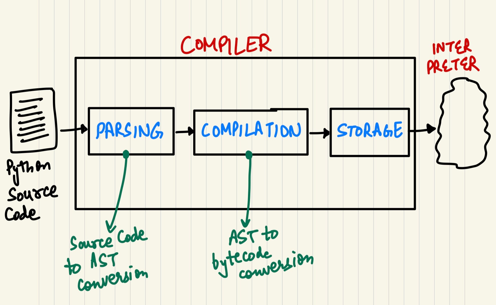 Compilation: The AST is converted into bytecode, a lower-level, platform-independent representation of the code.