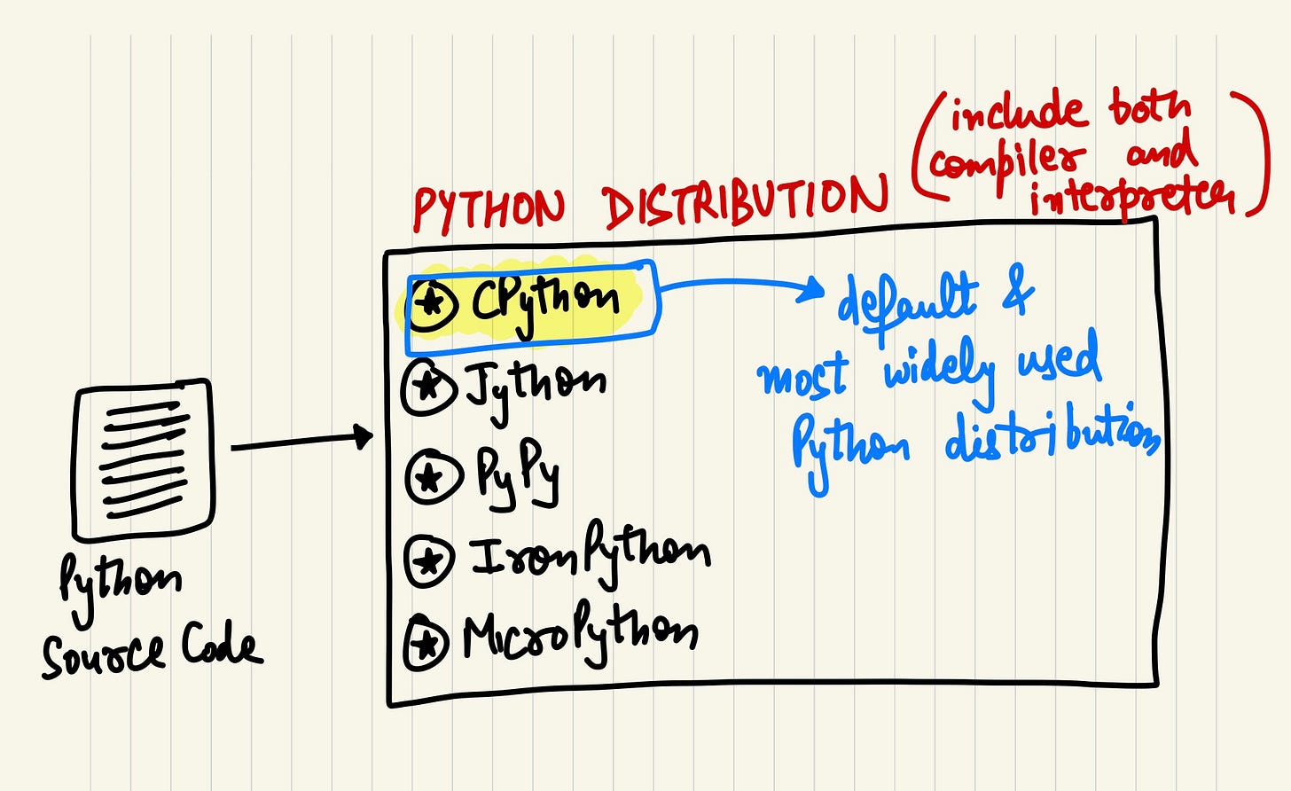 Now there are a lot of python distributions which have a combination of built-in compiler and interpreter both in them. CPython is the default and most widely used implementation of python programming language. It’s written in C, and it compiles Python code to bytecode and then interprets that bytecode to execute the program.