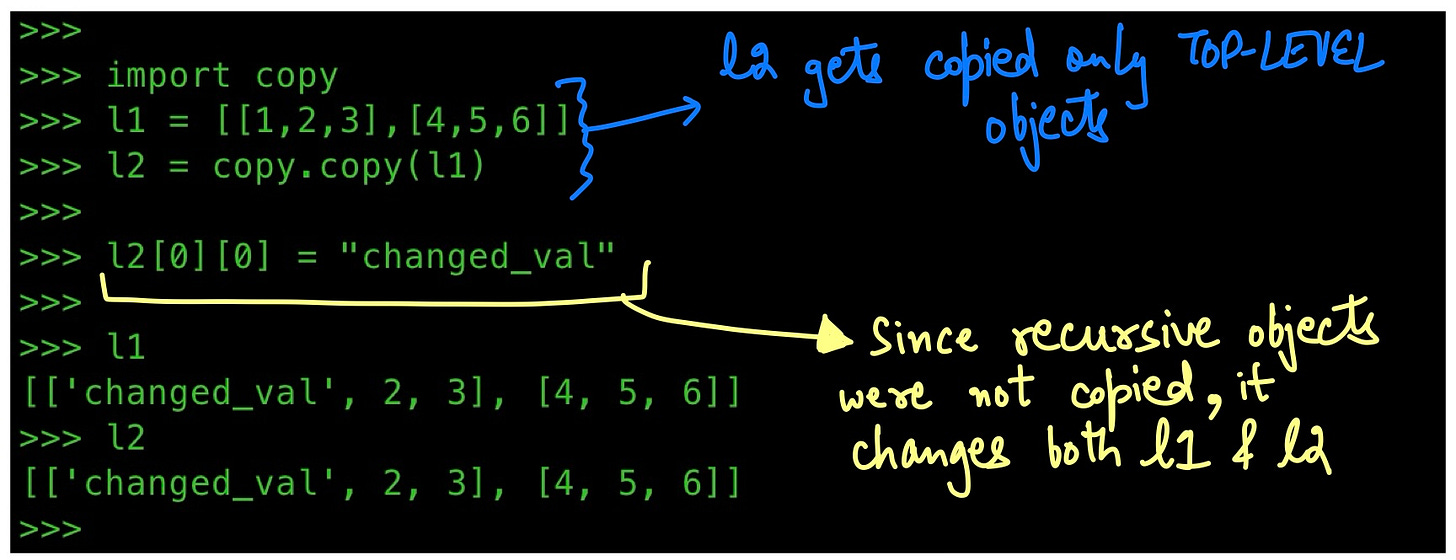 Remember, if you only need a copy at the top level, go with a shallow copy (copy.copy()); if you need a completely independent clone of all nested objects, go with a deep copy (copy.deepcopy()).